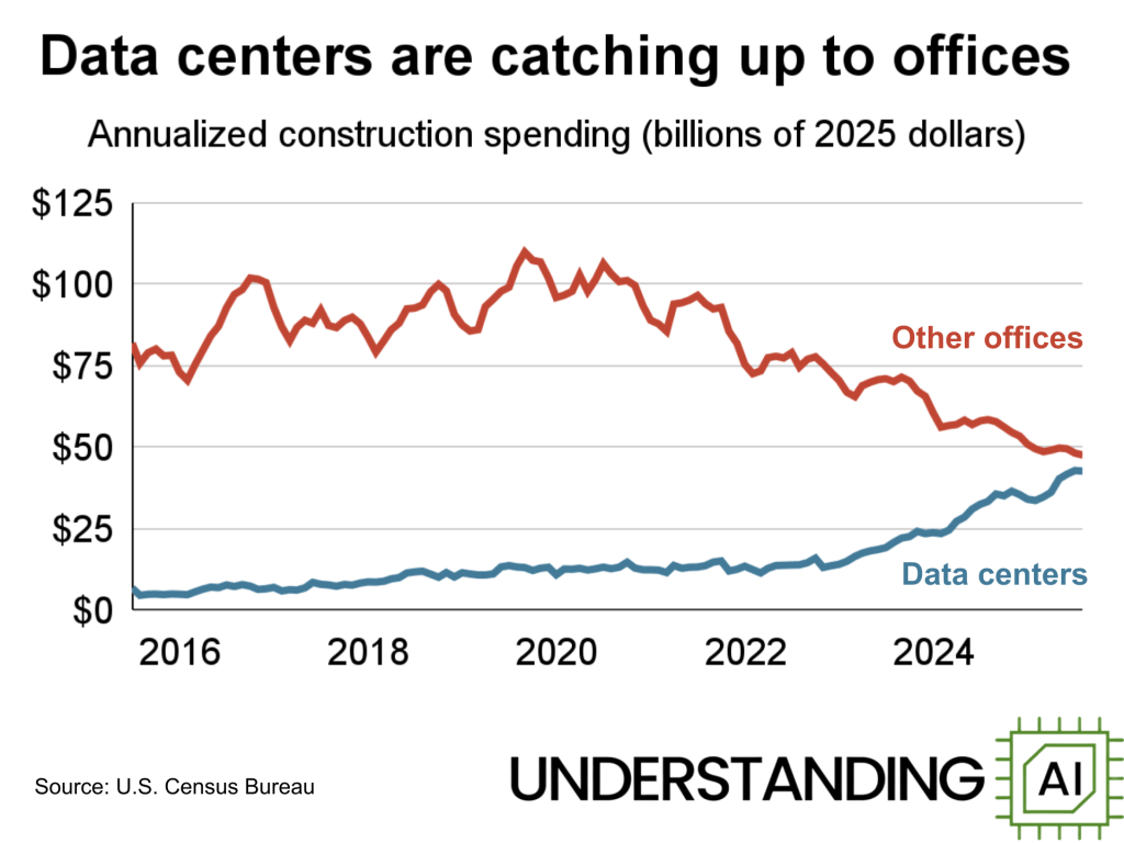 *Nota Bene: It is interesting to observe less money being spent on office construction, a trend caused not only by the rise of hybrid and remote work but also by the increasingly salient reduction in demand for office workers, some of which may be offset by AI. Real estate data show that “office conversions and demolitions will exceed new construction in 2025,” and in the International Monetary Fund’s Managing Director, Kristalina Georgieva’s outlook, it is estimated that “in advanced economies, about 60 percent of jobs may be impacted by AI.”