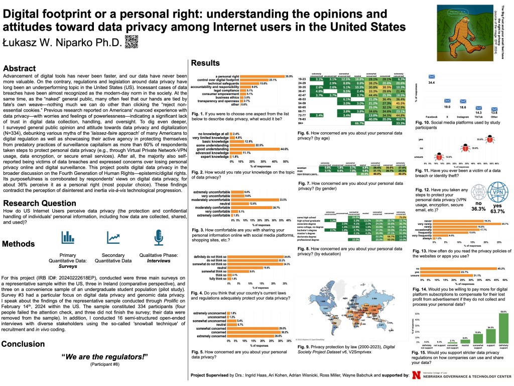 In the winter of 2024, I surveyed general public opinions and attitudes toward data privacy and digitalization. Results revealed that over 60% of respondents had taken steps to protect their data privacy, challenging the perception of Americans’ passive approach to digital regulation. Additionally, I conducted three surveys in the United States, three in Ireland (to provide a comparative perspective from the European Union’s highly regulated digital landscape), and three on an undergraduate convenience sample (pilot studies). A majority of participants reported data breaches and voiced concerns over digital surveillance and privacy loss—findings that fueled my interest in this field. Additionally, I explored global data privacy regimes, including the so-called “Brussels effect,” and integrated perspectives from the Global South to propose frameworks for equitable data governance in an AI-driven world. My research situates digital data privacy within the broader discourse on the Fourth Generation Human Rights—specifically digital rights (Risse, 2021), for 36% of my respondents perceive data privacy as a personal right (a most popular choice). These findings indicate a growing understanding of digital human rights and contradict the perception of disinterest and inertia vis-à-vis technological progression.